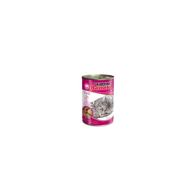 Karma Super Benek Chunks bezzbożowe kąski z cielęciną w sosie – zawierają 95% mięsa i produktów pochodzenia zwierzęcego w kawałku są bez zbożowe, bez dodatku cukru, barwników i konserwantów. Wzbogacone o taurynę, biotynę oraz witaminy B1 i E.