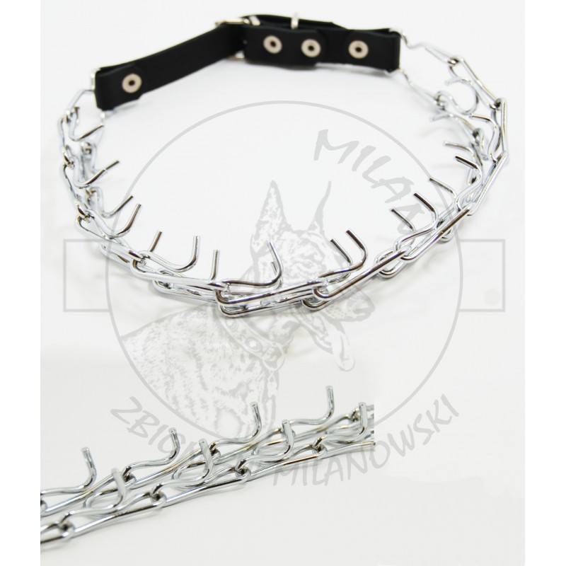 Podana długość dotyczy całej kolczatki. Metalowa kolczatka ma budowę łańcuszka, którego ogniwa zakończone są wystającymi, tępo zakończonymi końcami drutu - kolce są ustawione pod takim kątem, by nie wbijać się w skórę, tylko uwierać psa - przy odpowiednio założonej i stosowanej kolczatce, kolce nie mogą zrobić psu krzywdy. Zakładana na szyję psa ostrymi elementami na zewnątrz lub do wewnątrz.
