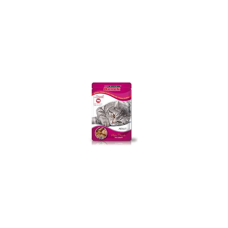 Smaczne mięsne kęski z dodatkiem wołowiny w aromatycznym sosie. Sprawią, że ich smakowi nie oprze się żaden kot. Karma pełnoporcjowa dla kotów.